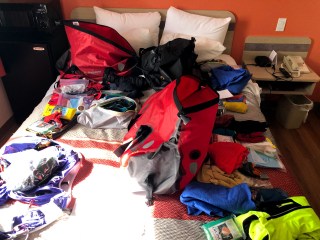 “Jumping in the car now” Pete texted me around 4:30 am on the Wednesday before the race. I had just finished my streak-mandated 5 miles. I hadn’t been sleeping a lot in the weeks leading up to the race unlike a mild success prior to Boston but I did my best. I had been playing with packing for about four weeks and as the race weather became more certain, the weekend before I settled on my final packing list. This included three pairs of shoes (Speedgoats, Salomon s/lab Ultra 2, Salomon XA Amphibs), three vests, poles, three headlamps, and more calories that anyone could get in during the race. For nutrition, I had been practicing with Maurten, a colloid gel drink that contains 320 calories in 500 mL of water. Given that this approximates how much the gut can absorb in an hour, I vaguely understood that I couldn’t just drink that if it was hot as I’d need more hydration but I figured it would have to be a game-time decision on how to hydrate. I also had been practicing with GUs gels, waffles, and GU blocks. They all worked great on training runs with no GI issues (this is typically running code for diarrhea but in ultras it can also be vomiting). My plan was to get nutrition only through the stuff I brought with me. At ultras, aid stations will typically have real food but having had some GI issues at the two 50 milers, I decided I was going to stay disciplined with just my stuff. The result was a full size bag weighing about 45 lbs plus a planned carry on. Pete then texted me that he was going to do carry ons and shared photos of what appeared to be a tiny roller and satchel. Embarrassed, I repacked into a 35 L carry on and a “personal item” that was a 32 L backpack. Both were bursting at the seams and I needed to wear the Salomon Ultras to make things fit. No one was going to claim I was arriving unprepared for this. So I grabbed my two giant “carry on” bags and joined Pete in the cab.