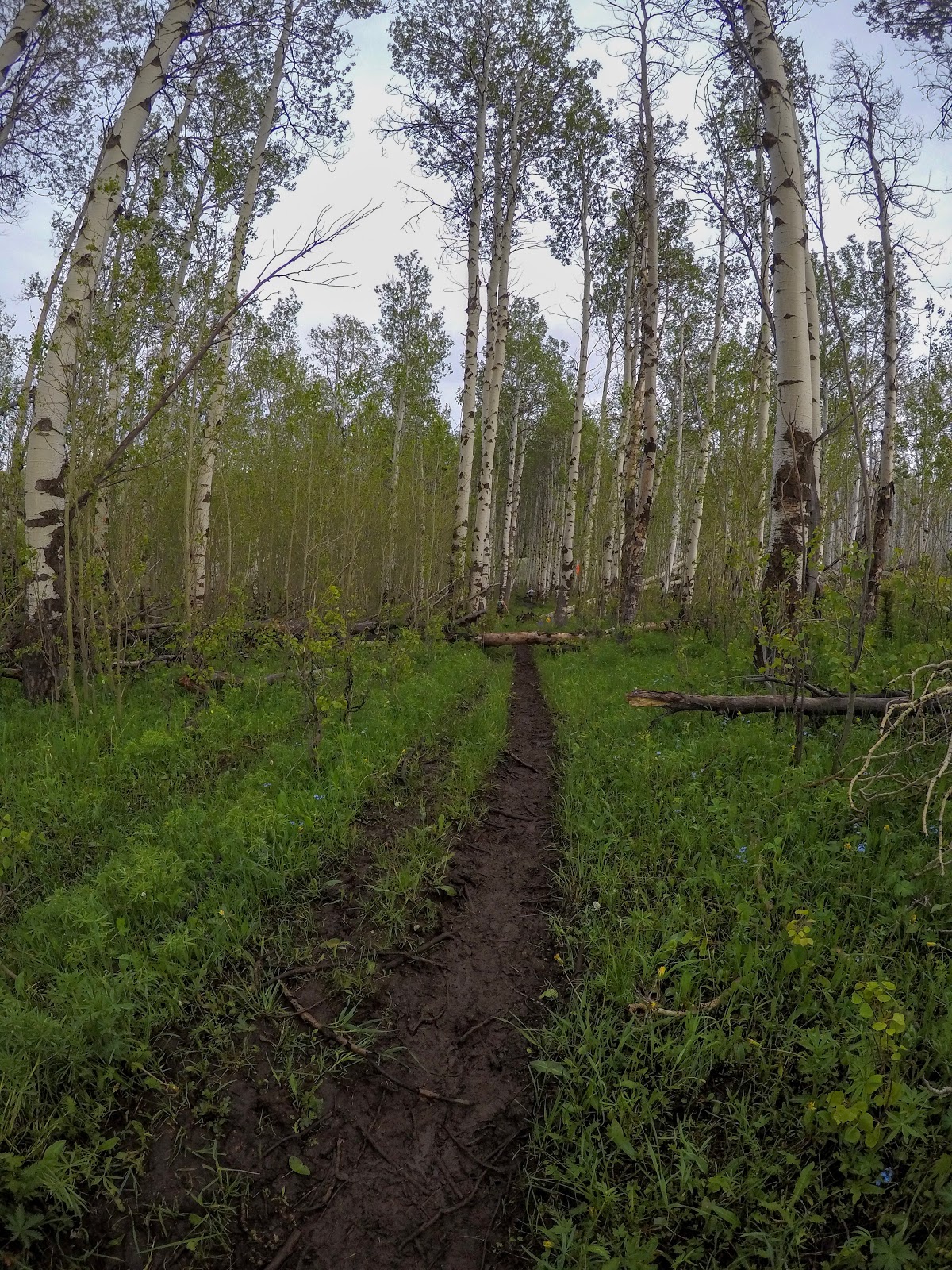 There was a lovely downhill out of Dry Fork on a road and it was entirely runnable. I pointed out to Pete that the poles were fine but totally inessential up to this point. I started chatting with some other runners and learning about their experiences with race from past years. I spoke with a runner from Powell on the far side of the Bighorns and he said this section on the way back was a real challenge. I started to pull ahead to Pete and as I was feeling under control, figured I’d stick with it. I rolled through Cow Camp at mile 19.5 and again just had water refills. Somewhere in here I tried to fill my bottles with Maurten but it proved hard to dissolve in the cold water. Over the next 7 miles it started to rain lightly – out of nowhere. By this time we were back on single track and with just a few drops of rain, the mud started to form. It was immediately comical as it stuck to my shoes and they went from lightweight to heavy in a matter of steps. Most of the group I had been running with stopped to put on jackets but I was perfectly comfortable in my sleeves and just kept going leaving that little group behind.
