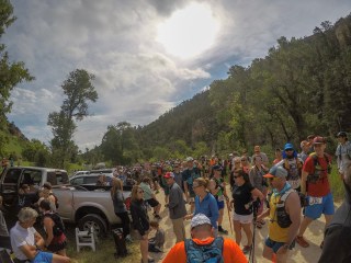 Following the remarks, our band of 6 boarded a school bus and got a ride the few miles up to the start. Once there, we had more than an hour of waiting and sat on a wooden bridge over the Tongue River. By then the sun was coming out but it wasn’t hot. With about 15 minutes to go, we assumed our places near the start. Doug headed toward the back for what he planned as a slow climb to the turnaround at Jaws to avoid the ever-lurking vomit monster who has stalked his prior 100 mile attempts. Pete and I headed towards the front aiming to be in the top 100 – for unclear reasons. My plan was to stick with Pete for as long as we both felt about the same and then to take off if I was feeling good or let him go if I was a mess