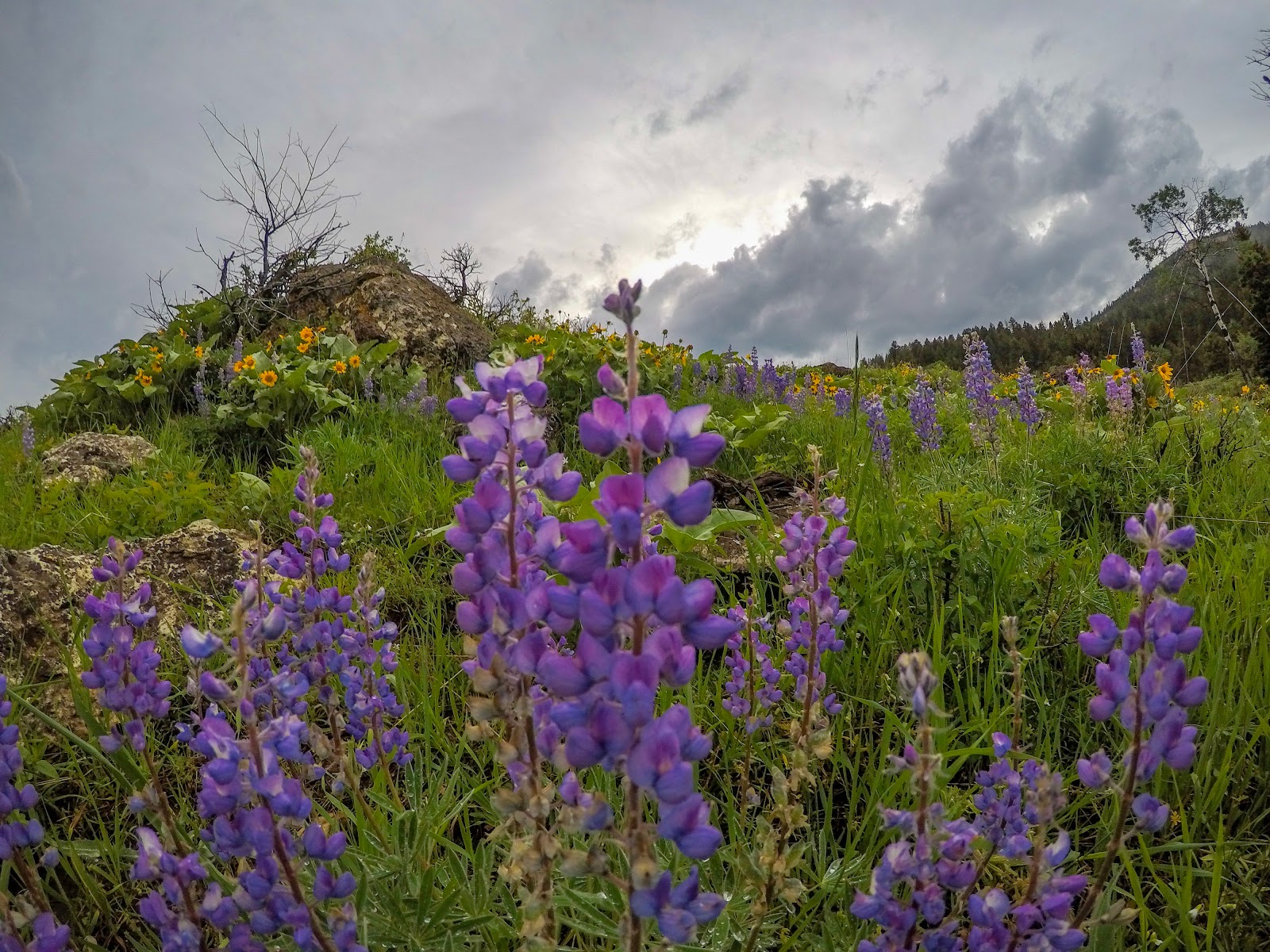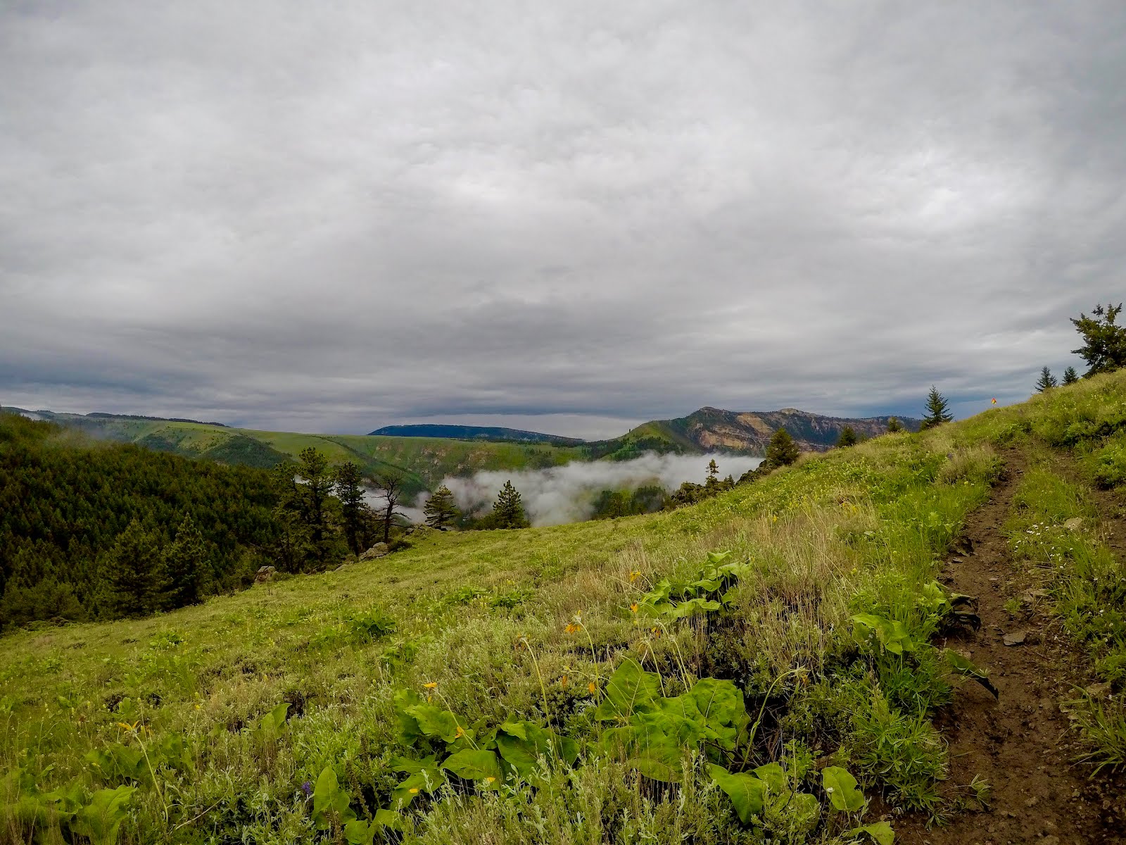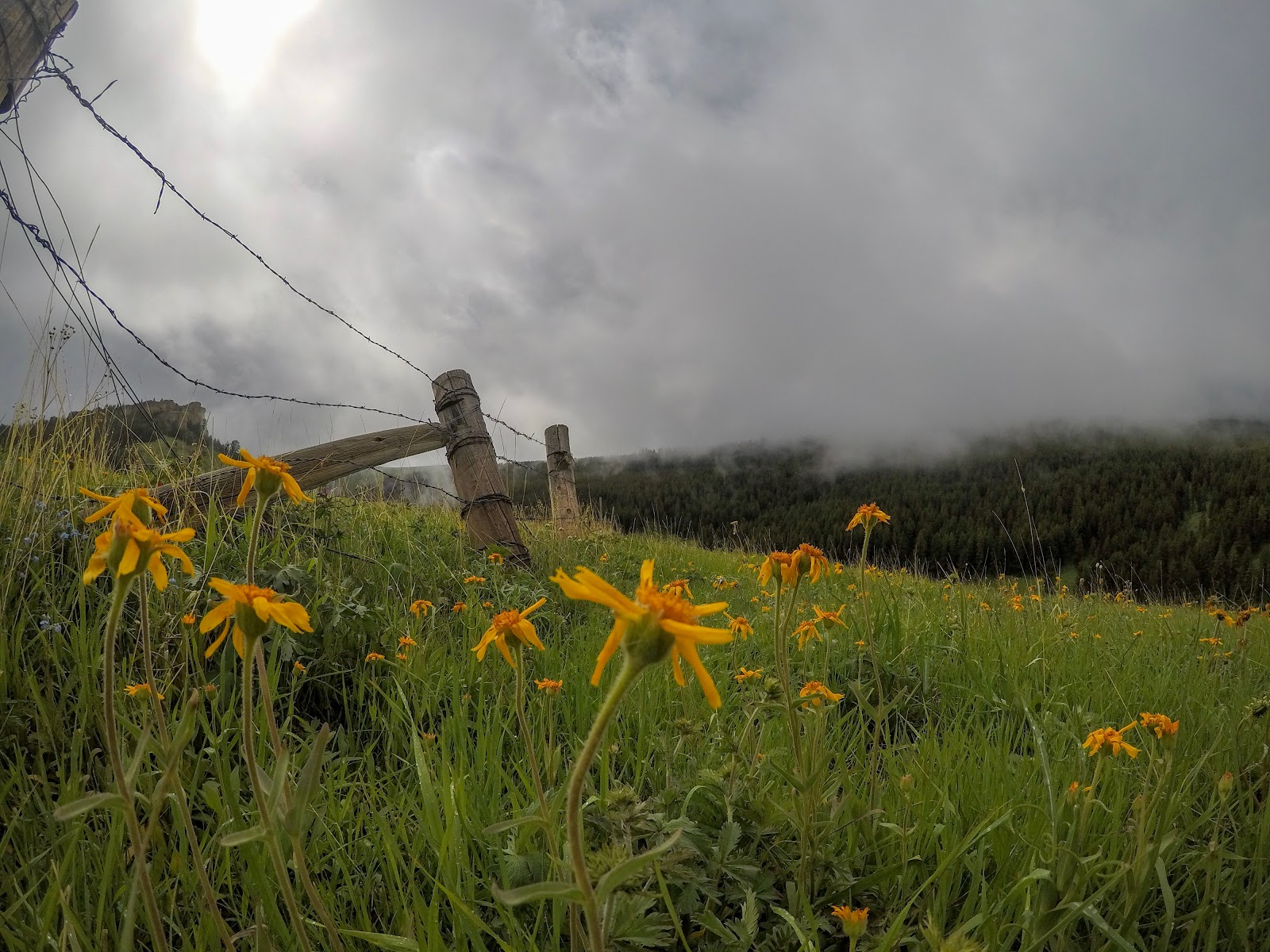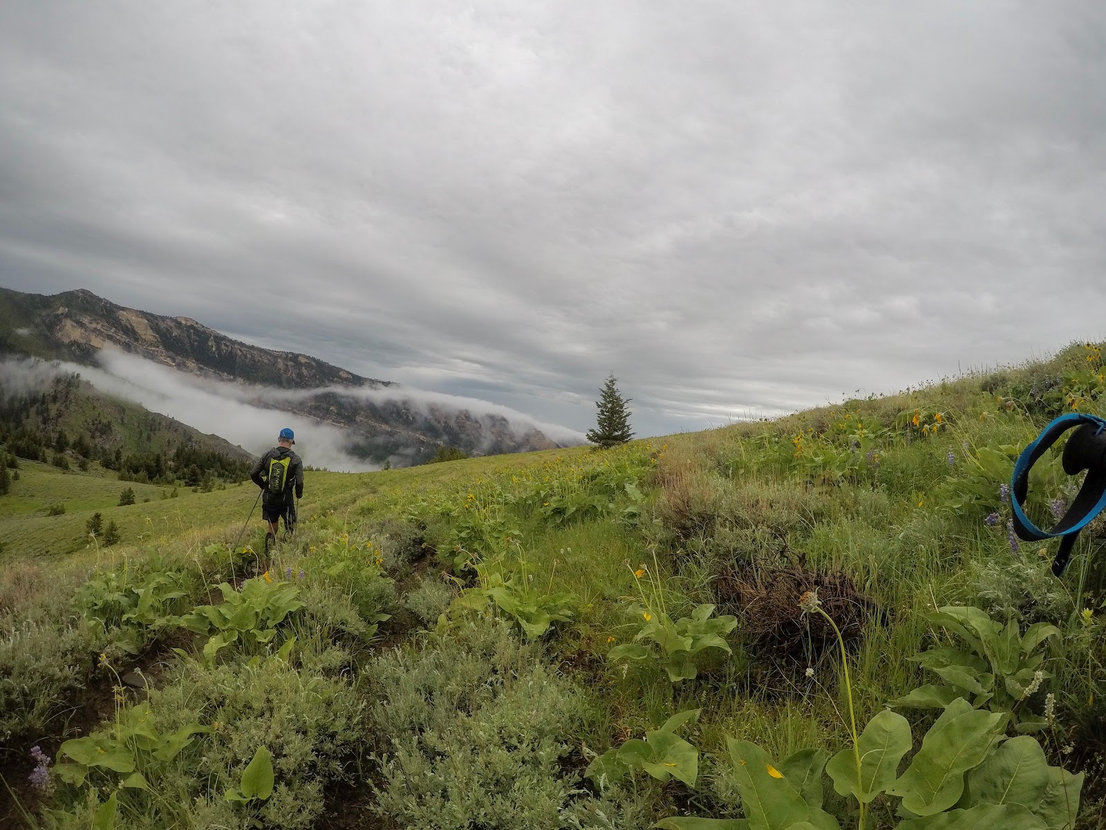 The first 1.25 miles is up the dirt road and we took it easy here getting passed by groups and waving to the drones overhead. We passed the aid station at the trail head without stopping and headed up the start of the single track. I was just in front of Pete and I just tried to keep up with the person in front of me. There wasn’t much talking in that line and we only had people passing us. At mile 3.5 there was another aid station and I got more water for the next steep climb. We started to climb up and out of the canyon to open meadows with yellow and purple flowers. There were very steep sections but the line moved at approximately the right pace. The views were impressive looking back but soon we were in the clouds and visibility decreased. The trail was dry and while there was some distant thunder, there was no rain. We followed a barbed-wire fence, maybe too closely, and eventually came over the top of a ridge and dropped down with the first running in a while to the Upper Sheep Creek aid station at 8.5. This was the first time I could easily pee and I refilled water bottles.