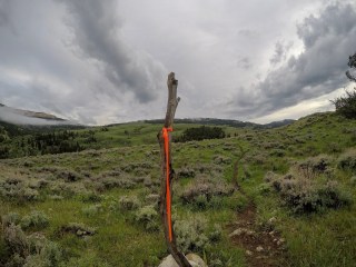 At Mile 26.5 I got some more fluids from Bear Camp and joined up with a runner from France and one from New York. We chatted about prior races including the challenges of UTMB last year as the rain petered out. At this point there were collections of hail here and there suggesting our rain had been hail just a few miles in front of us. We dropped out of the trees, through a notoriously deep section of mud, and onto a spectacular single track traversing across a postcard like meadow overlooking the Little Big Horn canyon. I knew from the map that Foot Bridge was far below. It was so beautiful and we were a bit giddy resulting in some yodeling and picture taking. I moved ahead and dropped through an increasingly muddy and slippery section down into the canyon and the clouds. Without much warning pea to marble sized hail started to fall. It was pretty warm and this was a runnable section. Believing that this was going to be a memorable moment, I turned on the GoPro and recorded myself running through the hail. I found it more amusing than scary and I passed someone waiting under a tree for the hail to stop. Within a few minutes I was down the river and crossing the metal Foot Bridge right into the aid station and my next drop bag; mile 30 and hour 6:39. I had spent a lot of time before the race trying to understand what my pacing might be and when I would get to various aid stations. I had a set of times for a sub 24 hour, 26 hour time and a 32 hour finish. As this was my first 100 and I did not want to get caught up in chasing times and having to quit, I focused only on effort and was not worried at all throughout the race about time goals. Regardless, I was about 6 mins off the arbitrary 26 hour time at this point.